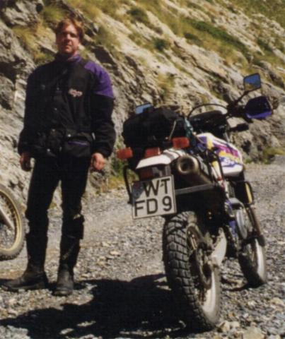Micky mit seiner neuesten Errungenschaft, eine DR650S, hier mitten in den Ligurischen Alpen auf der Ligurischen Grenzkammstrasse |