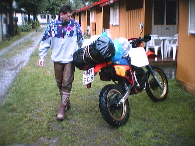 Dirk und seine Kawasaki, KLR600, Bj. 86 oder so, sein erstes Motorrad, hier muss sich das Hinterrad- Lager verabschiedet haben. |
